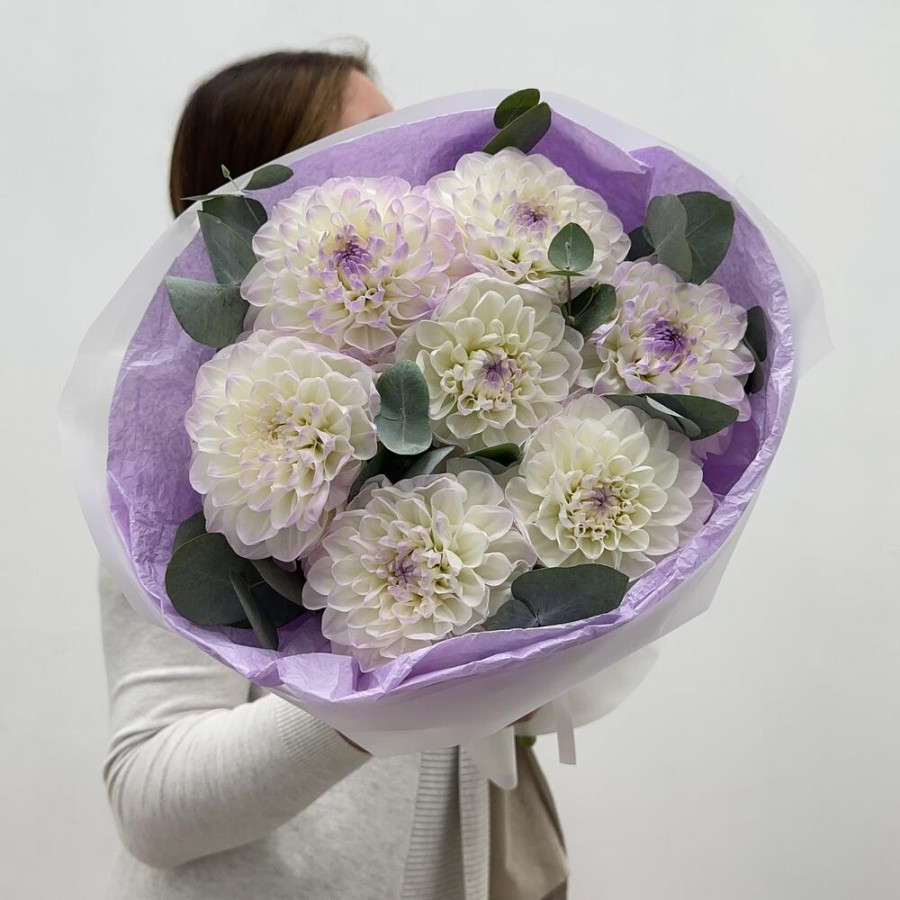 Букет из 7 бело-лиловых георгин с эвкалиптом в Горбатове